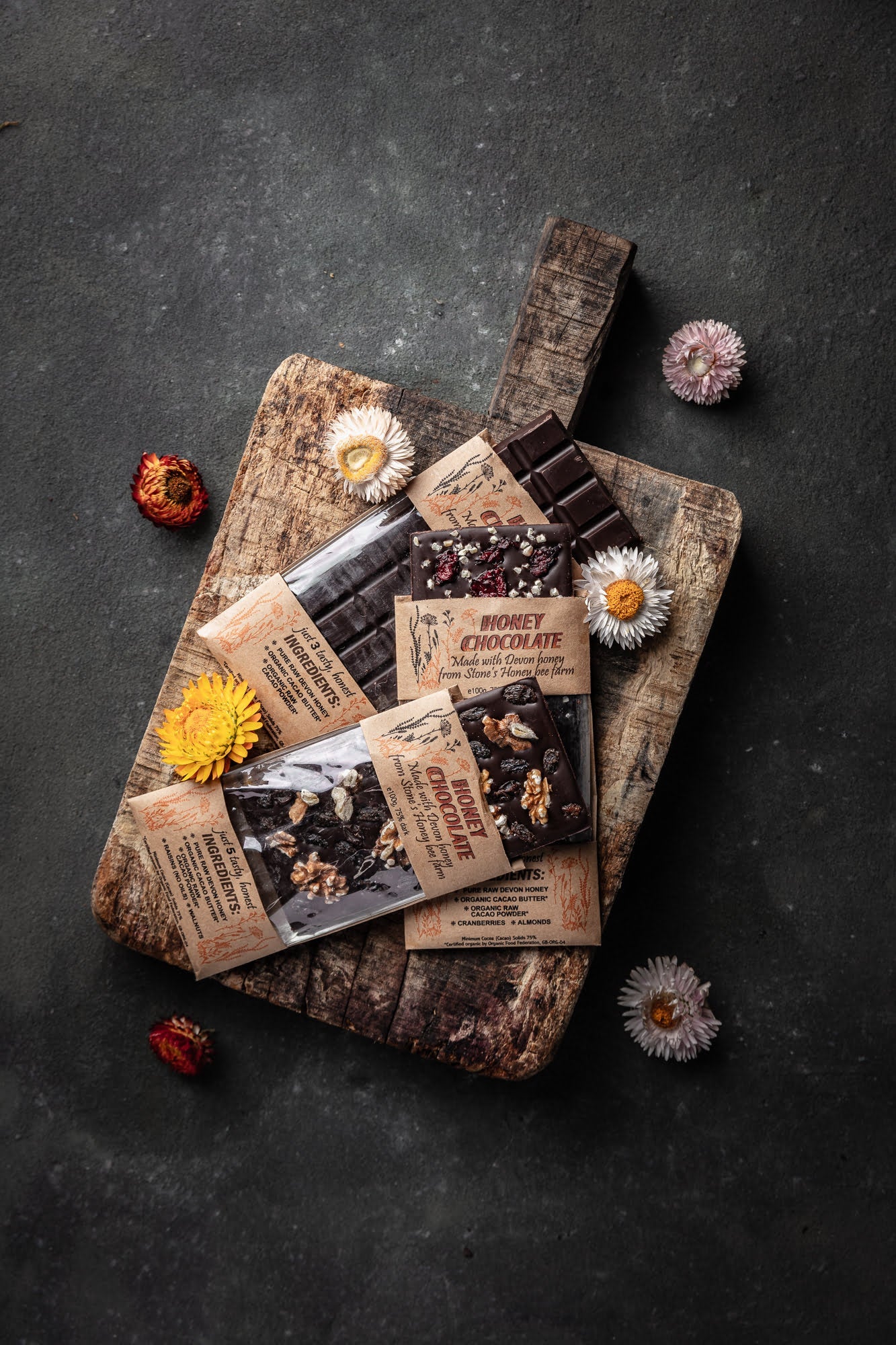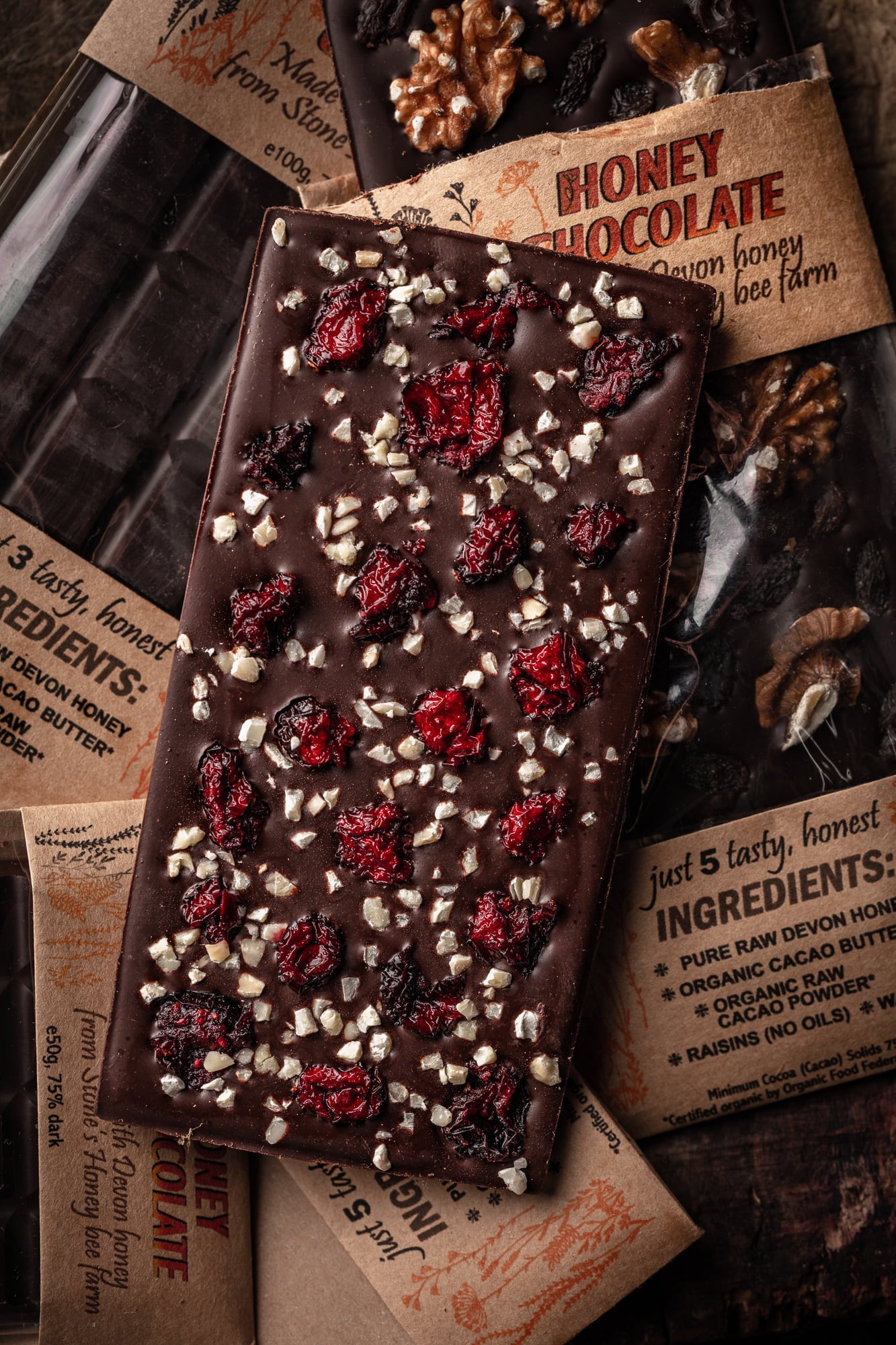 This bundle of three dark chocolate bars is the ultimate treat for honey lovers and chocolate lovers too! Each of these 100g Honey Chocolate bars in our 3 bar variety pack is made with pure unprocessed and unheated Stone’s Devon Honey and is packed with a range of vitamins, minerals, enzymes and antioxidants. The organic raw unroasted Peruvian Criollo cacao that is used is just as nutritious as the honey, making these bars a truly healthy and guilt-free treat and a great choice for those who are trying to reduce their consumption of processed foods. All of these natural nutrients are preserved by keeping temperatures below 38◦C during the chocolate-making process. The fruit and nut toppings are also free of artificial ingredients – no preservatives, oils or additional sugars have been added.