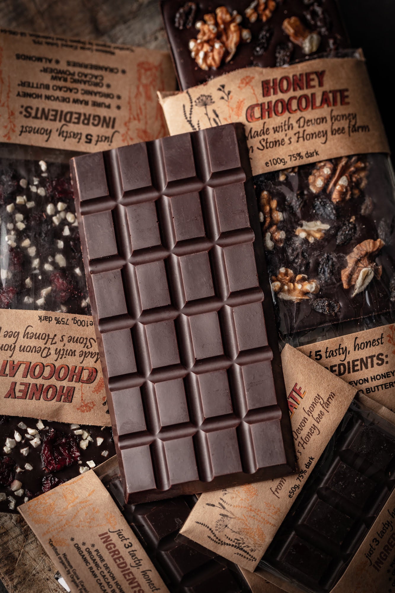 This 100g bar of Plain Honey Chocolate contains 75% dark chocolate, but even milk chocolate lovers will appreciate what a creamy texture and delicious taste it has – all due to Stone’s Pure Devon Honey of course! Absolutely no white, brown or coconut sugar, no stevia or any other sweeteners, no preservatives, no “nasties” at all. Perfect for people who love dark chocolate but prefer a healthier treat.