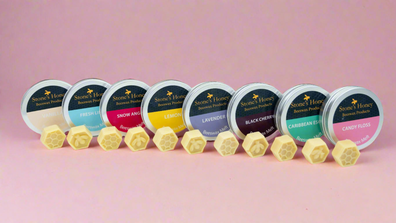 Bee-Themed Wax Melts: Hand-poured in Devon, these wax melts are made from 100% natural beeswax sourced directly from our hives. Blended with coconut oil and high-quality fragrance oils, they offer a clean, long-lasting burn and an exceptional scent throw. Each reusable aluminium tin contains four beautifully designed melts, available in 8 luxurious scents: